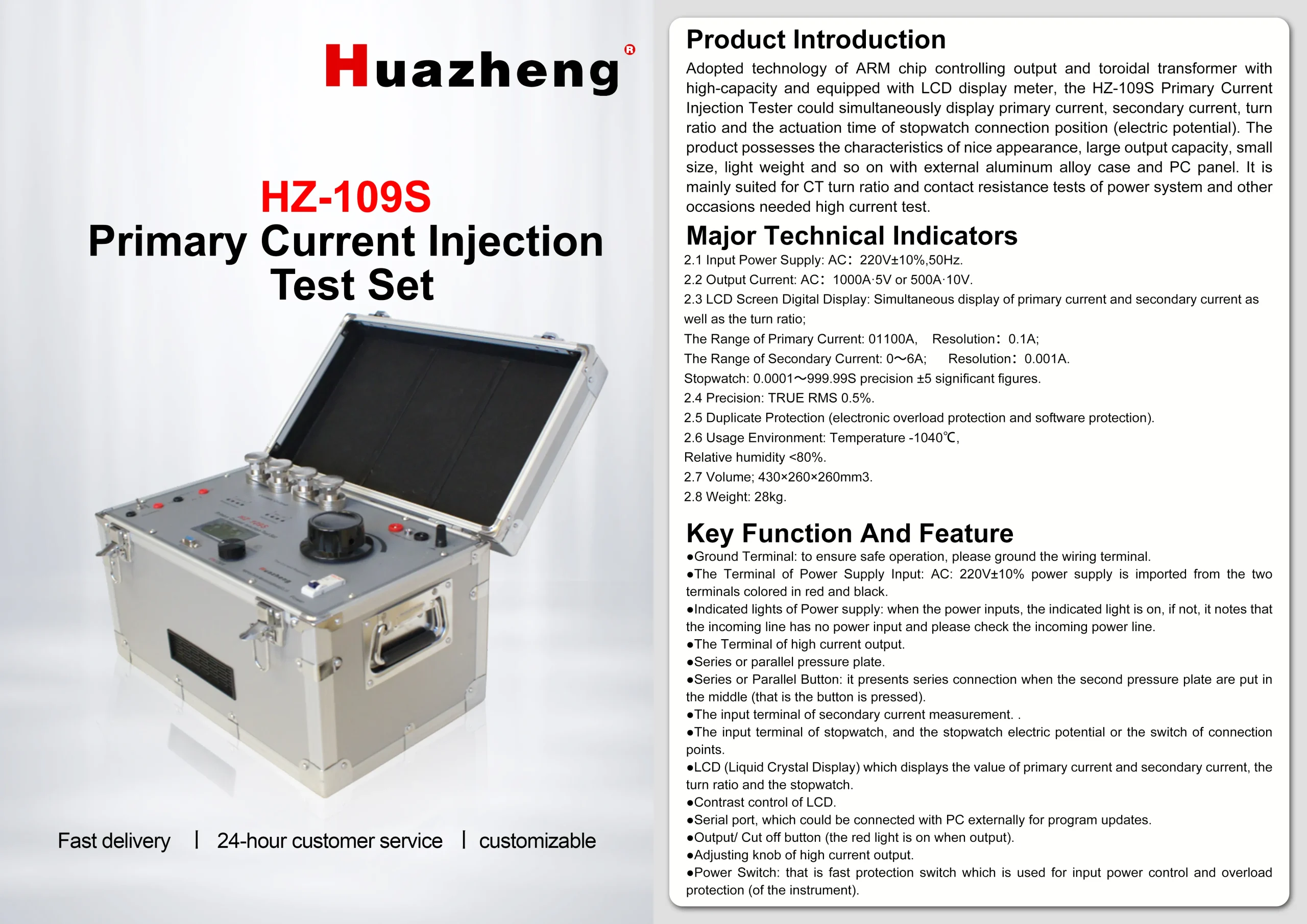 Установка первичной инжекции HZ-109S2 от Huazheng Electric оснащена современными функциями, повышающими эффективность испытаний. Многие модели имеют цифровые дисплеи для удобного контроля параметров, программируемые режимы для различных сценариев тестирования, а также встроенные системы защиты для обеспечения безопасности оператора и оборудования. Компания также уделяет особое внимание удобству эксплуатации, что позволяет специалистам быстро освоить работу с оборудованием.